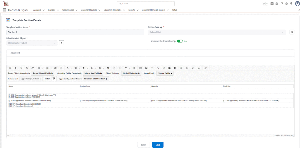 To design your document, select Related List as the section type and enable the Advanced Customization.