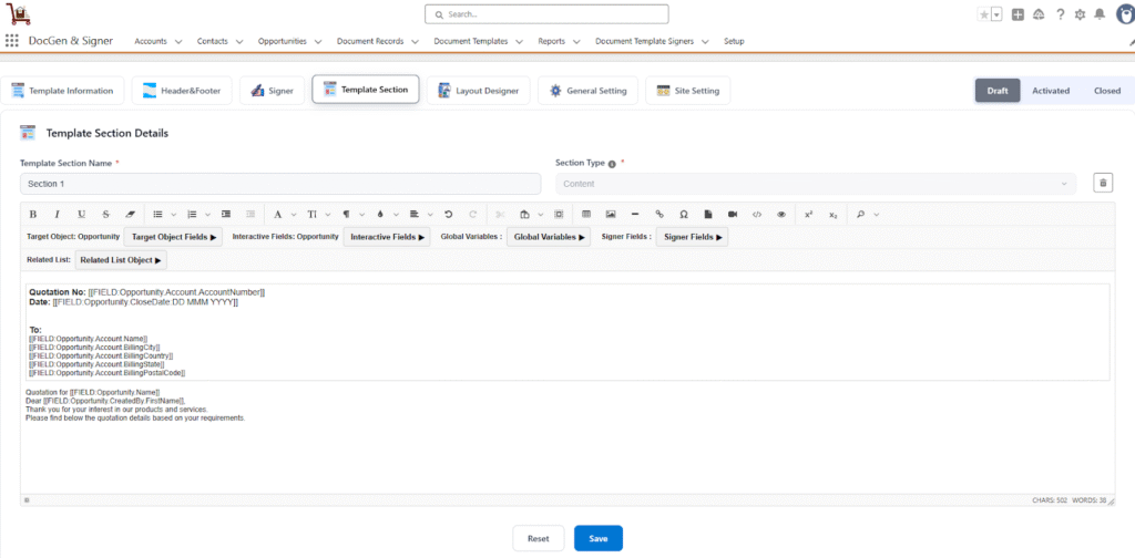 You use it to add formatted text, images and dynamic fields from the target object of your document (e.g., the Opportunity, Account). - Interactive Fields → These are special dynamic fields that allow the end-user to update their values directly within the document generation workflow. This provides flexibility to adjust data, such as quantities or dates, to meet specific requirements before the final document is produced.