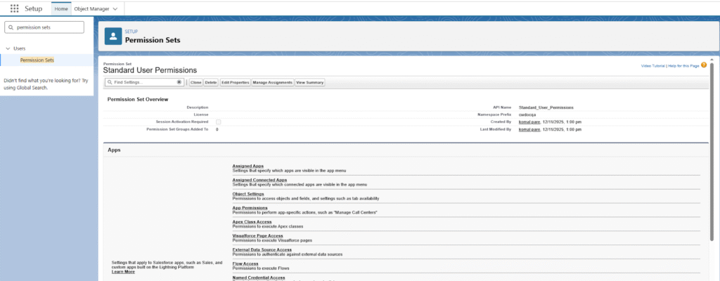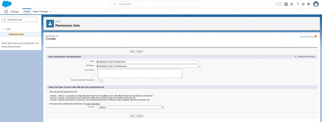 ➢ Enter a Label for the permission set. (Standard User Permissions) .The API Name will be automatically populated.
