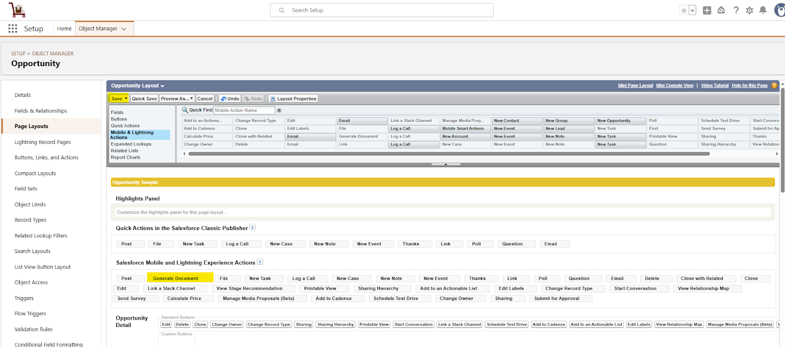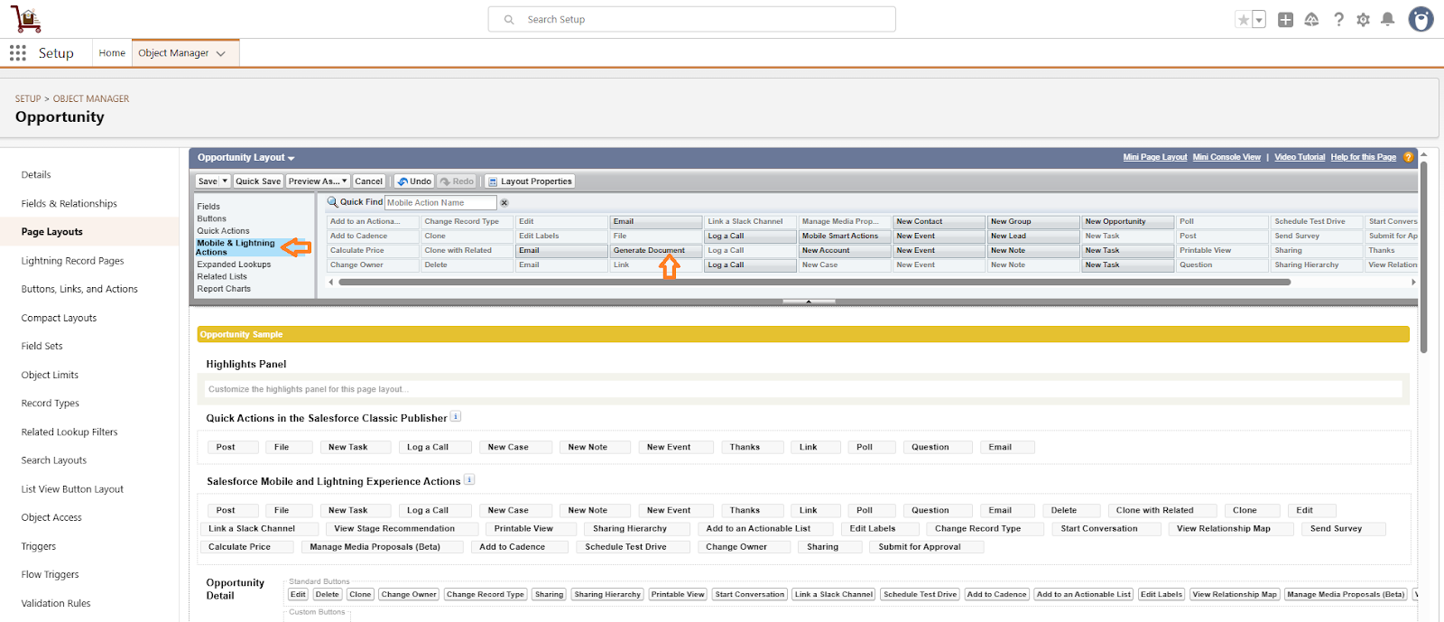 ➢ In the Layout editor, Go to Mobile & Lightning Actions.