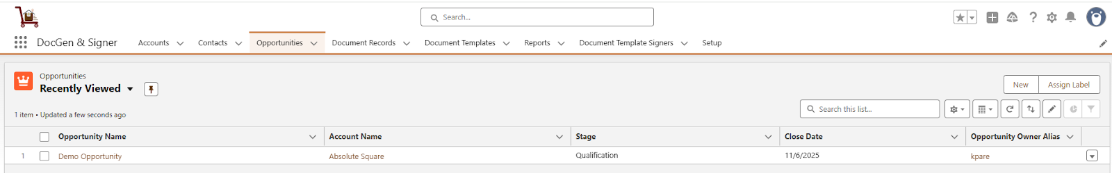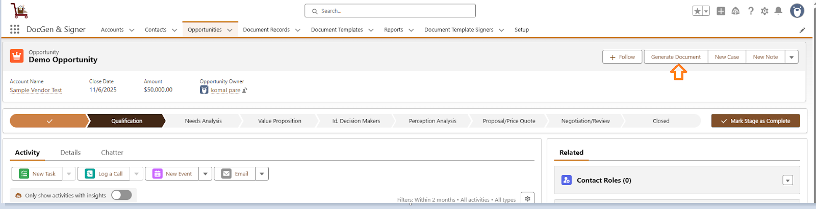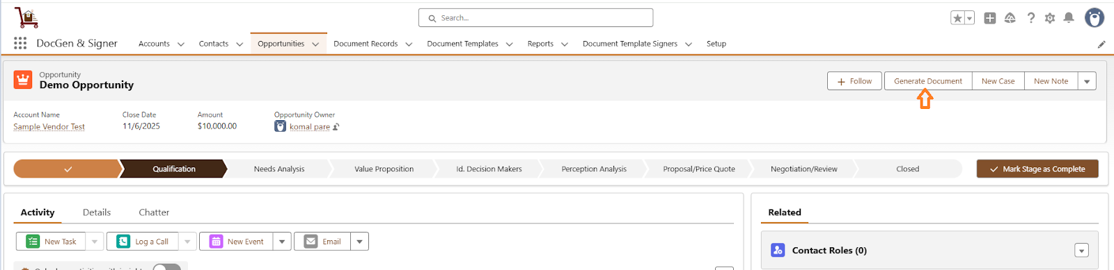 ➢ Return to the object record page and refresh to view the Generate Document button.