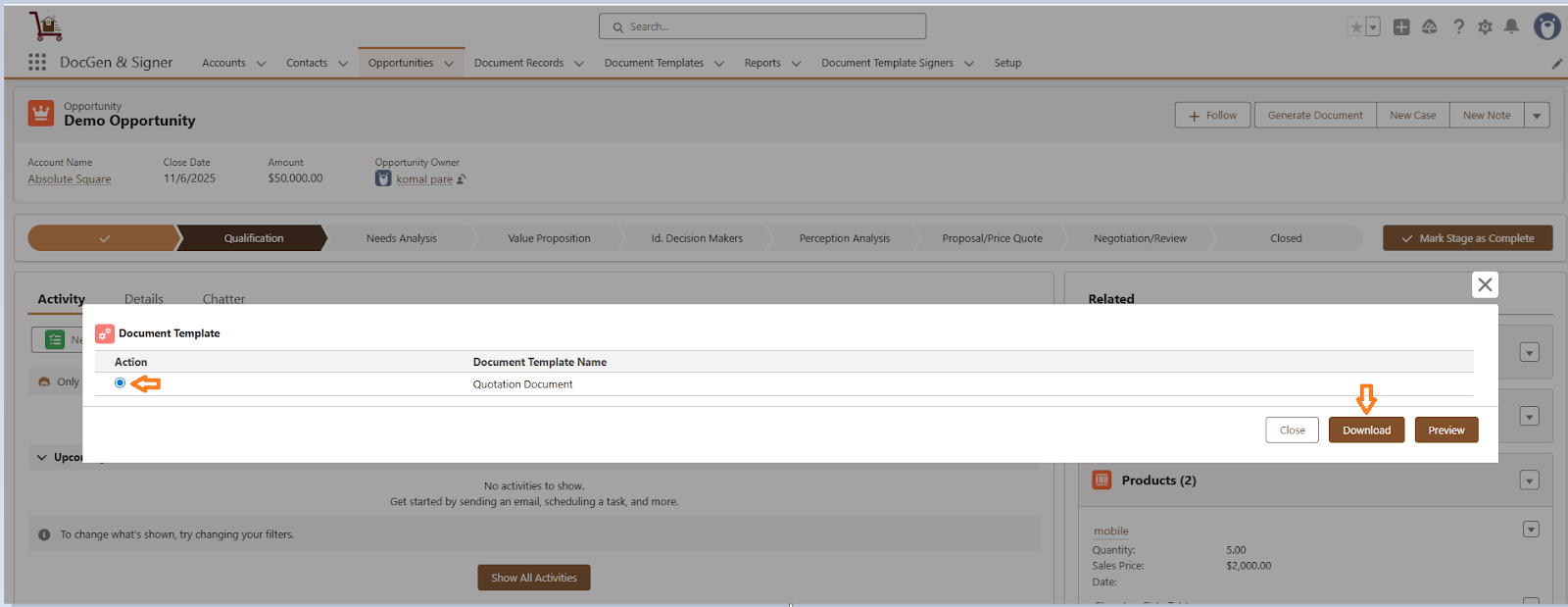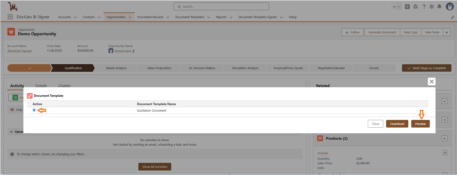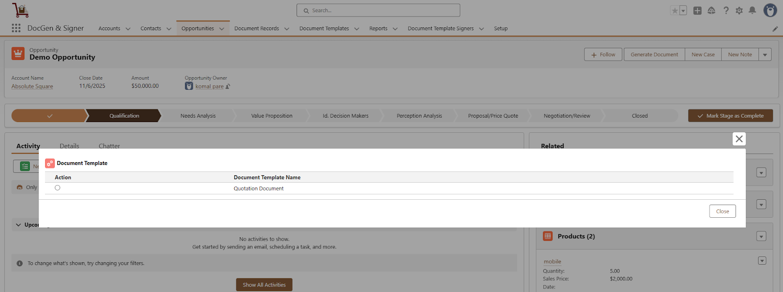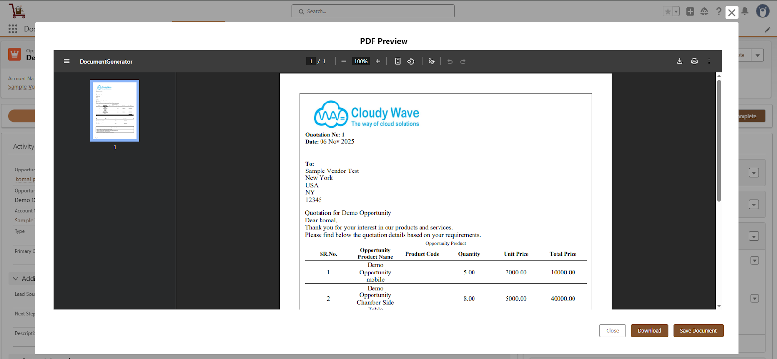 The document generation process automatically creates finished, professional documents by combining your pre-designed template with live data from Salesforce. Once your template is fully configured with dynamic fields, layout design, and branding settings, generating a document is a seamless one-click process.