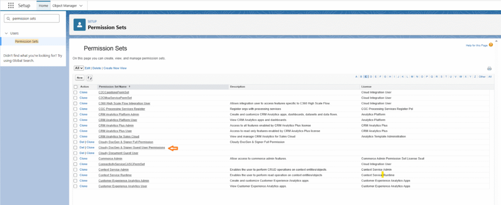 ➢ Locate and open the Cloudy DocGen & Signer Guest User Permissions permission set.