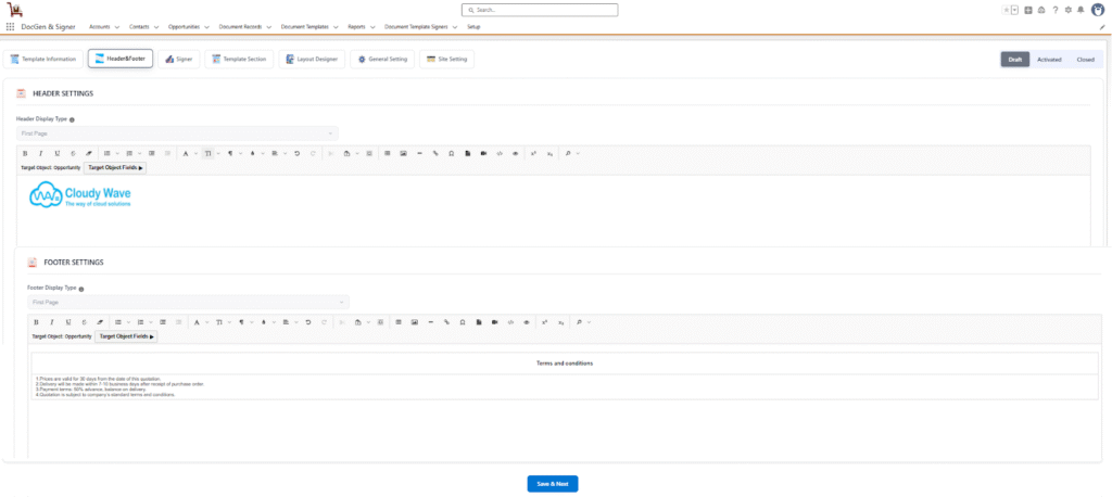 • Header & Footer Display Type β†’Β  Choose where the header and footer should be displayed (e.g., First Page, All Pages, Last Page, First & Last Page).