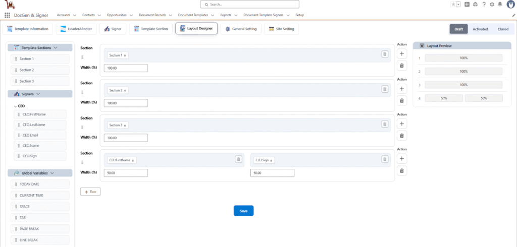 Note: The created template sections and signers must be added to the layout; otherwise, they will not be displayed in the document.