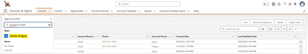 Search for the “ DocGen and Signer ” in the app launchers search box.