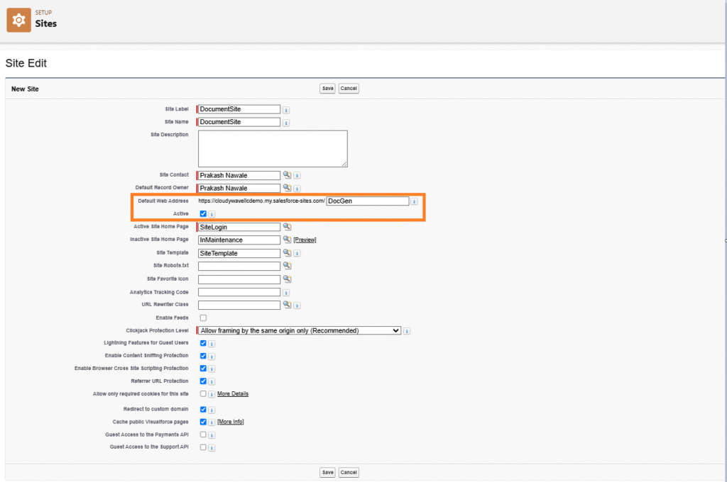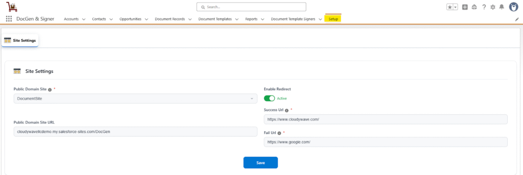 This process enables us to configure system-level settings necessary for document generation and signing. It includes linking the document process to a Salesforce Public Domain Site, setting up redirects, and defining success or failure landing pages or messages. These configurations ensure that signers experience smooth navigation and clear feedback while interacting with generated documents.