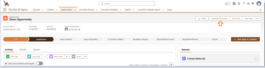 8. Return to the object record page and refresh to view the Generate Document button.