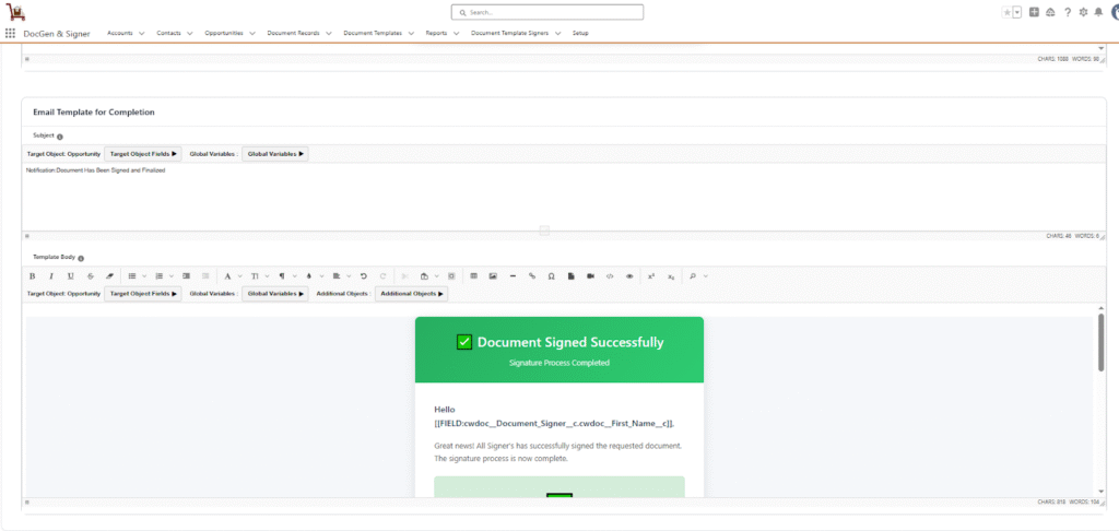 The Signer Details section allows you to configure the individuals or entities who will be signing the document. Once the Enable Signature option is turned on, default email templates will be displayed with a predefined subject and body. If required, you can customize these templates according to your needs.Ensure that you provide the correct email address to send the invitation for document signing.