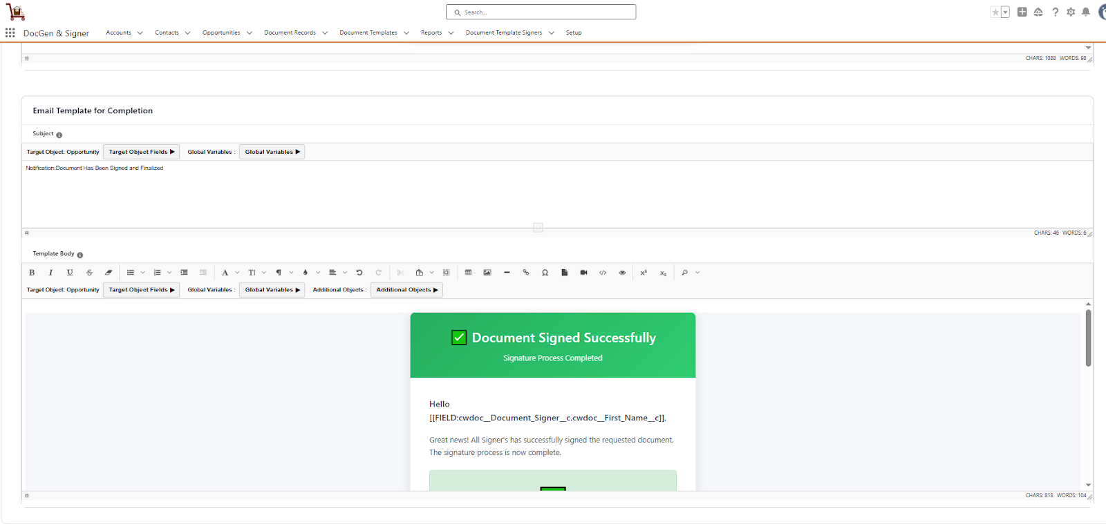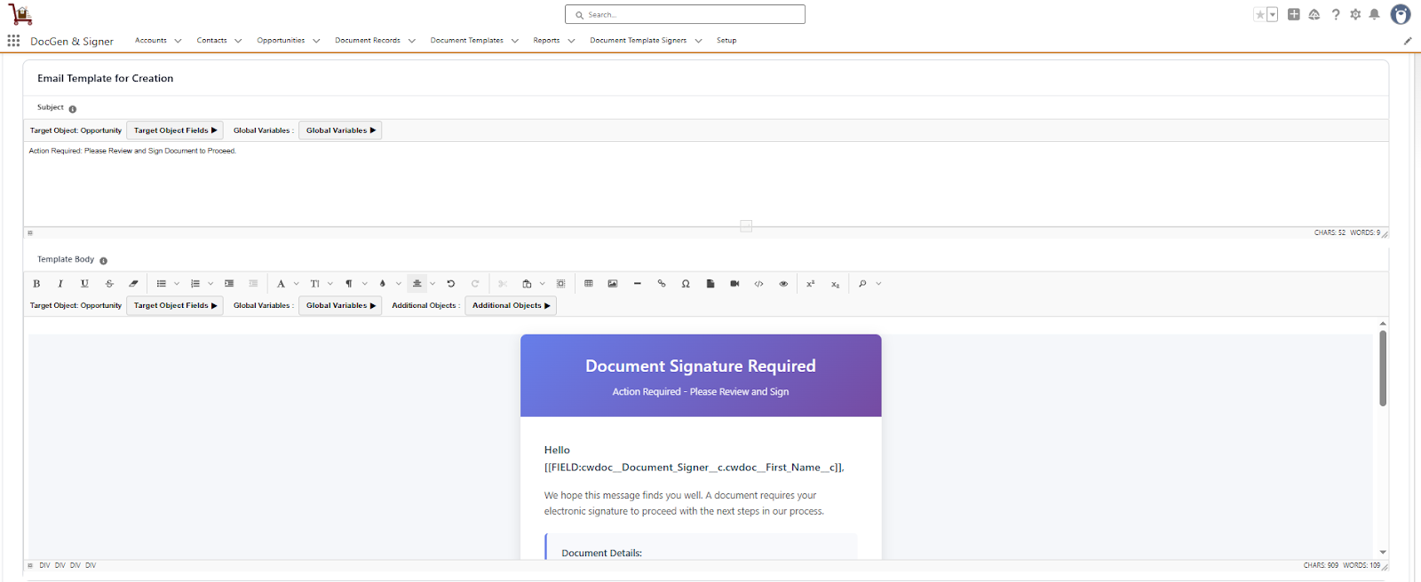 Once the Enable Signature option is activated, the system automatically displays default email templates containing predefined subjects and body content. These templates can be customized as needed.