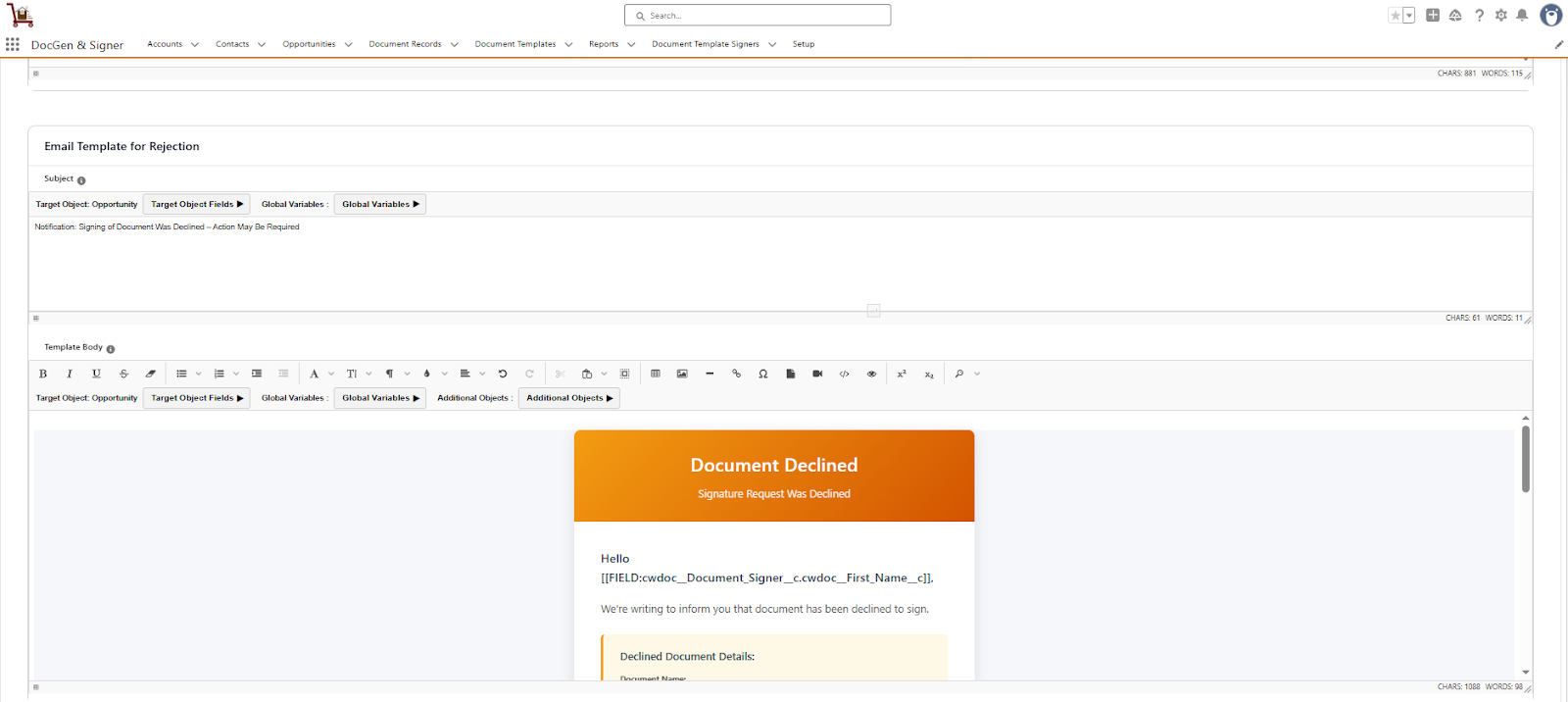 - Email template Rejection : This template is triggered when any signer declines to sign the document. It informs all involved parties that the document has been rejected and provides the reason for rejection if one was given.
