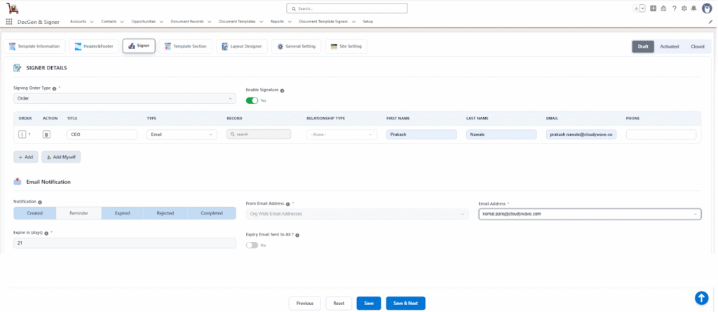 The Signer Details section allows users to configure the individuals or entities who will sign the document.
