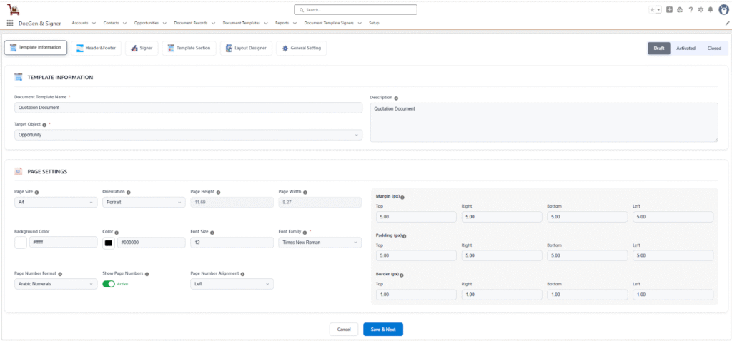 - Target Object → The Salesforce object (e.g., Account, Opportunity) on which this template will be generated