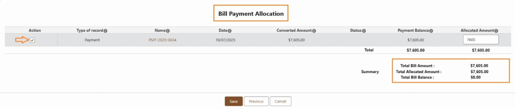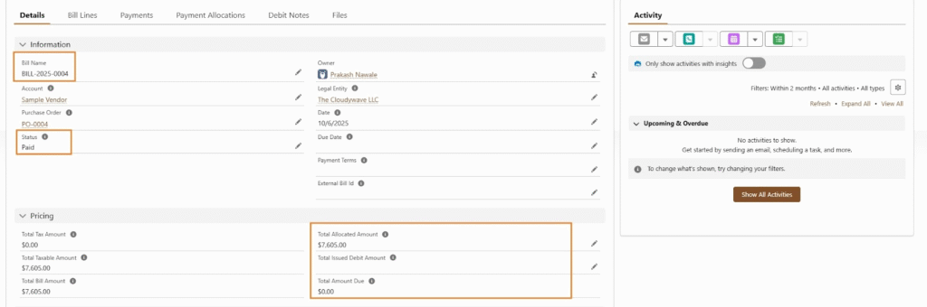 After saving, Payment Allocation records are created, the Bill status becomes Paid, and totals for allocated and due amounts are updated automatically, as shown below.
