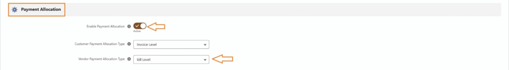 Note: To allocate Bill Payments, ensure the Enable Payment Allocation checkbox is selected on the Legal Entity, with Vendor Payment Allocation Type set to Bill Level or Bill Line Level (see screenshot).