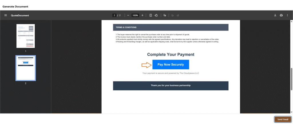 The Quote Document includes a “Complete Your Payment” section that allows customers to make payments directly from the document. By clicking the “Pay Now Securely” button, users are redirected to the payment gateway where they can complete their transaction safely.
