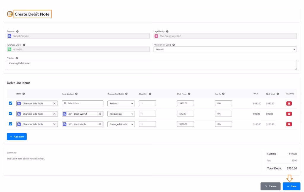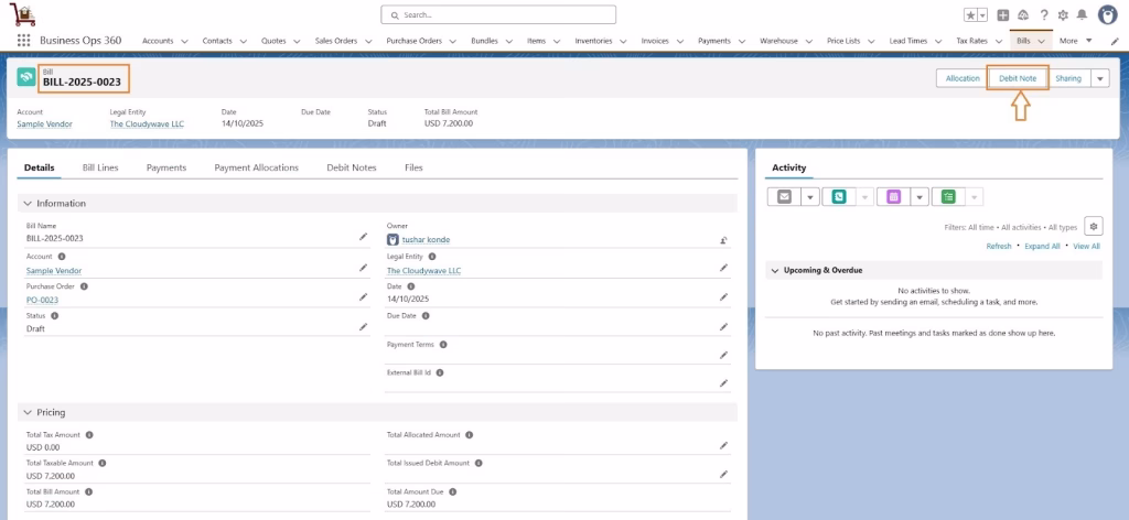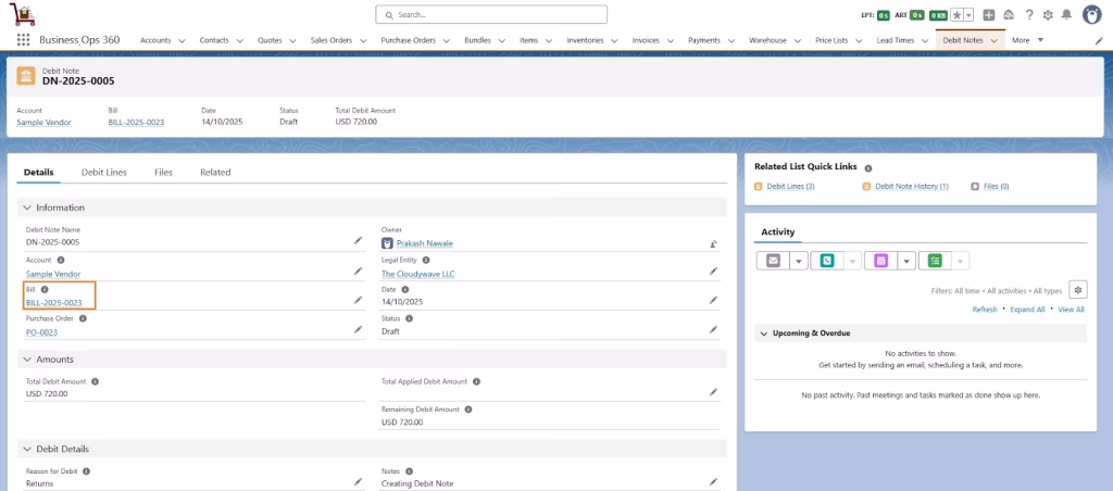 - The system updates the Bill’s Total Amount Due once the Debit Note is saved or applied.