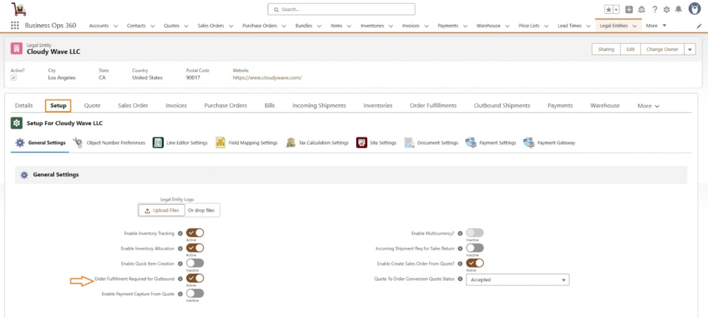 Note: To enable order fulfillment, you must select the Order Fulfillment Required for Outbound checkbox in the Legal Entity’s General Settings, as shown in the screenshot below.