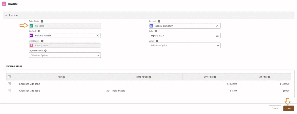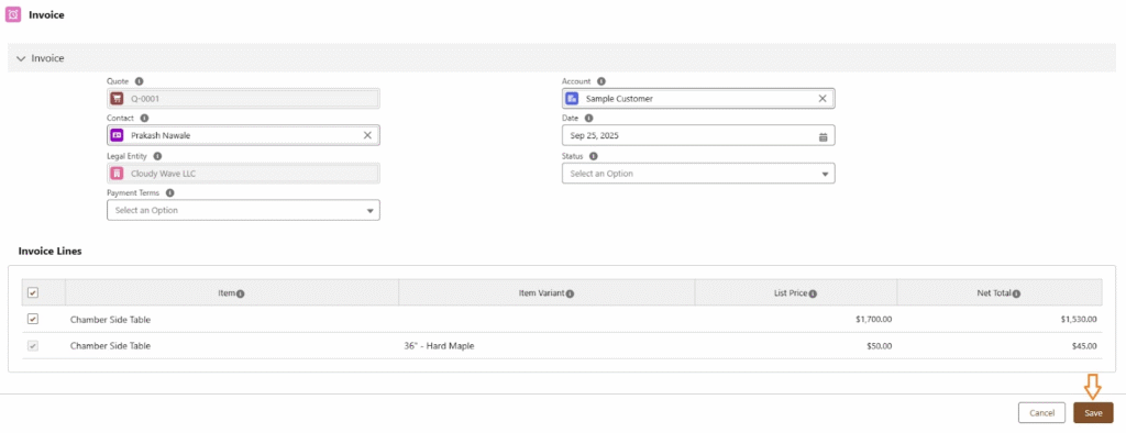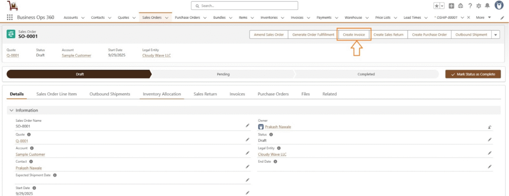 - Generate Invoice – System creates invoice from Sales Order or Quote.