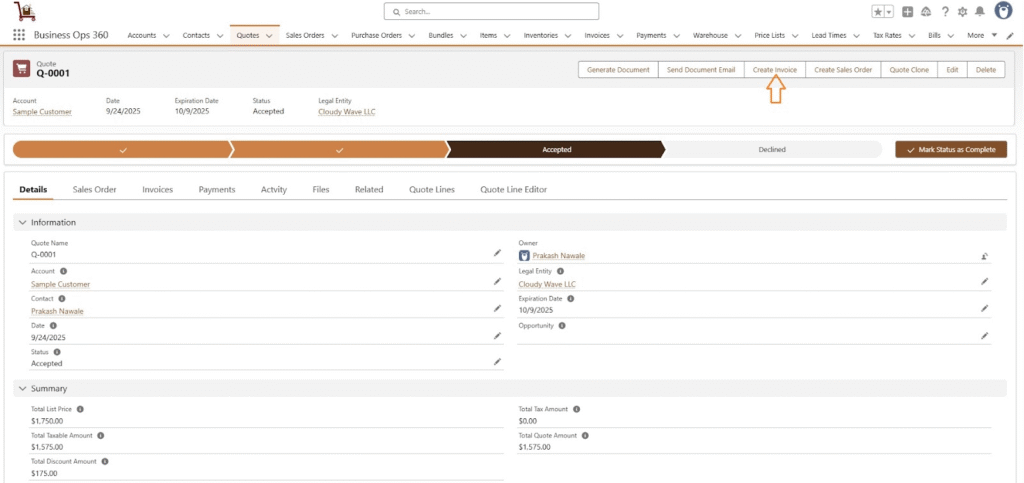 From Quote Tab ⇒ Select ‘Create Invoice’ action button on top right as below screenshot.