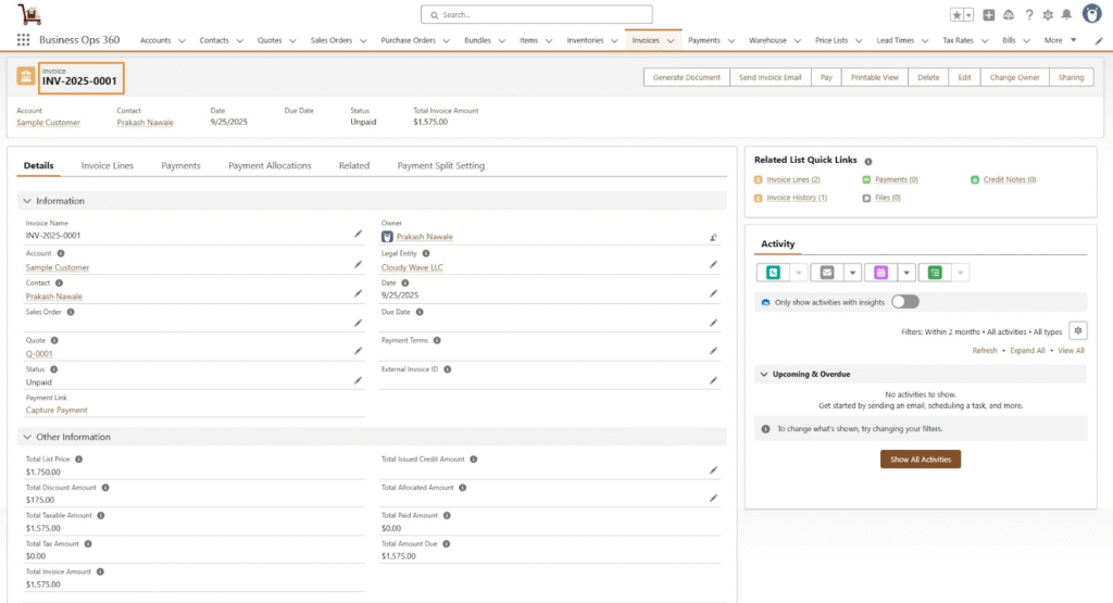 The Invoice object in Cloudy Business Ops 360 represents a formal billing document issued to a customer for goods sold or services rendered. It records the financial obligation of the customer, the payment terms, and the total amount due.