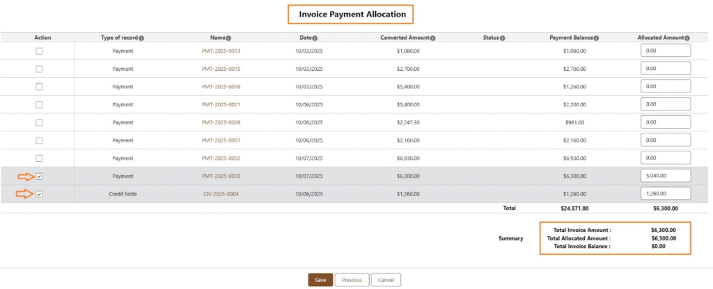 The system displays all Payment and Credit Note records available for allocation. Users can select the records to allocate, enter amounts for partial allocation if needed, and review that the allocated amounts match the invoice balance. Once confirmed, clicking Save updates the Invoice balance to reflect the allocated amounts accurately.