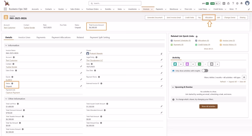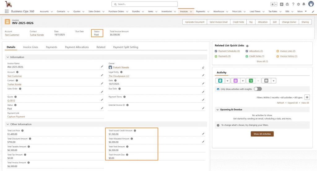 After saving, Payment Allocation records are created, the Invoice status becomes Paid, and totals for allocated, paid, credit, and due amounts are updated automatically, as shown below.
