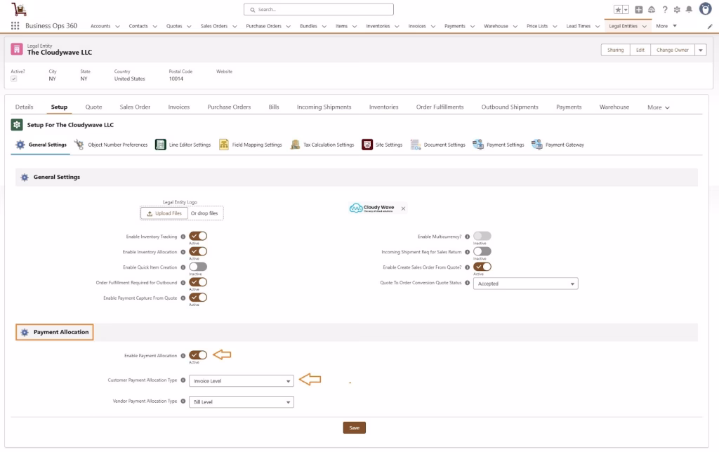 Note: To allocate Invoice Payments, ensure the Enable Payment Allocation checkbox is selected on the Legal Entity, with Customer Payment Allocation Type set to Invoice Level or Invoice Line Level (see screenshot).