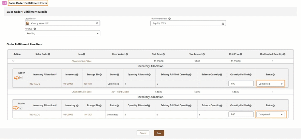 After clicking the ‘Generate Order Fulfillment‘ button, the Sales Order Fulfillment form appears as shown below,