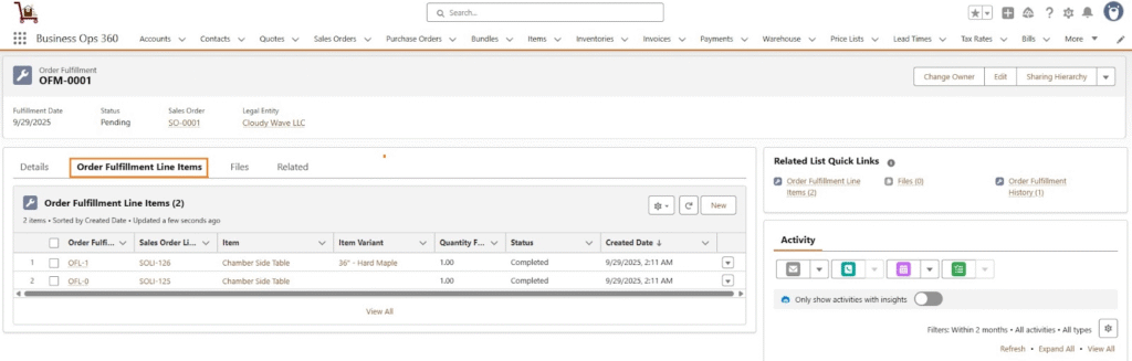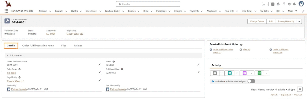 Click ‘Save’ to create an Order Fulfillment record as shown below.