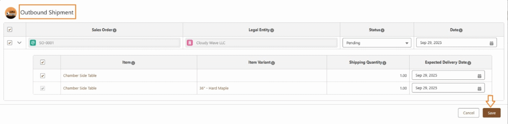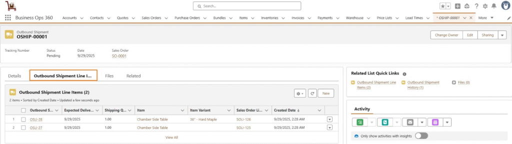The Outbound Shipment object in Cloudy Business Ops 360 represents the final step in the order fulfillment process — the physical movement of goods from your warehouse to the customer or destination.