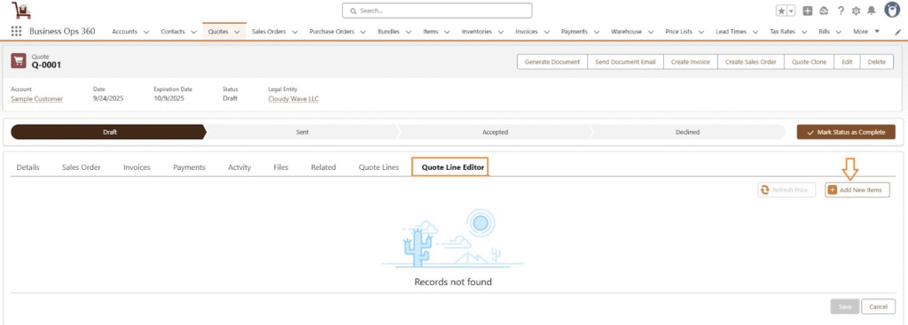 Quotes are available to add items into quotes using Quote Line Editor functionality.