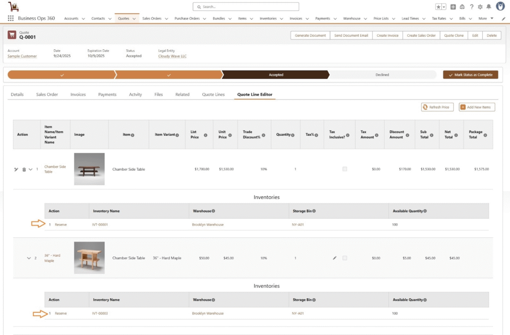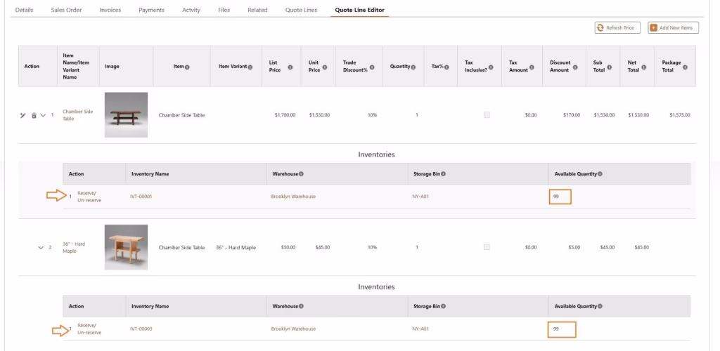 Click Save. The inventory will now be reserved, and the available quantity will decrease from the total available quantity.