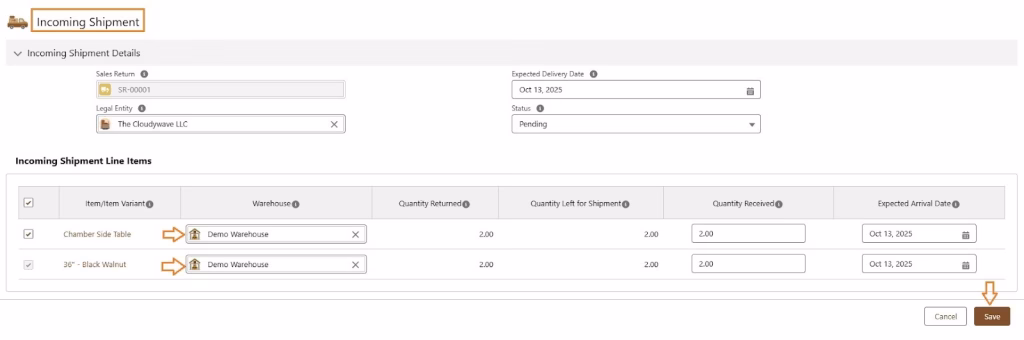 Now, Review the pre-populated Sales Return Form (items and Inventory Allocation details).
