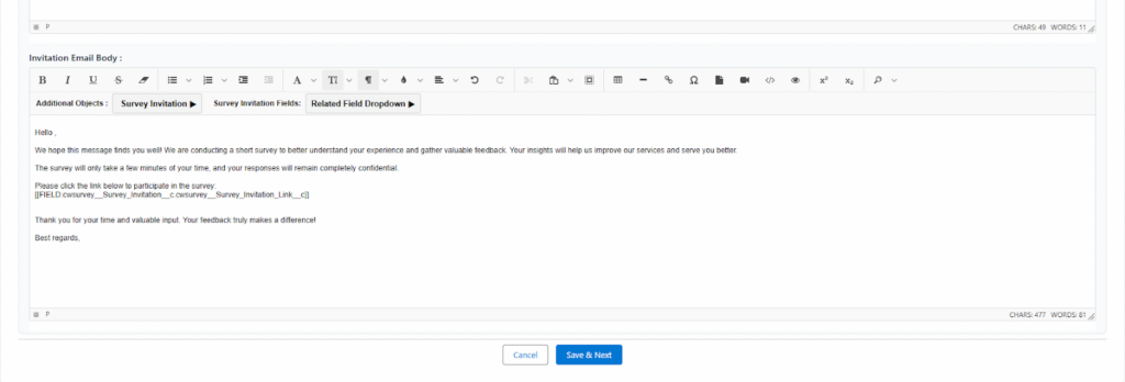 - Survey Link – Automatically generates and inserts the unique survey participation link for each recipient.