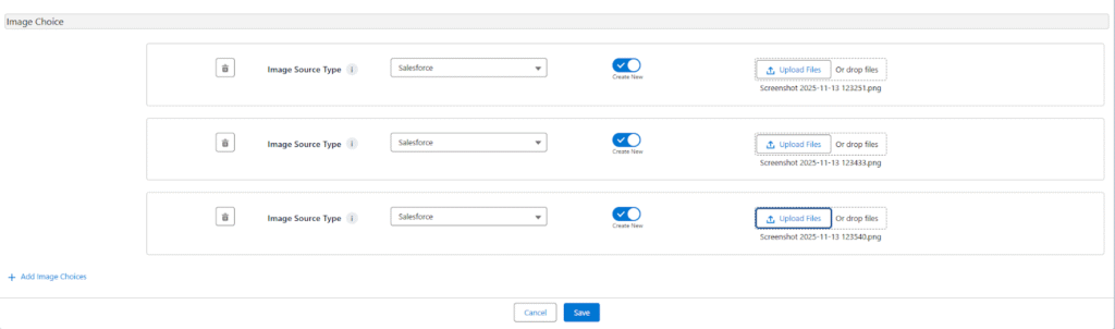 - Supports Salesforce file source type configuration for managed image storage.