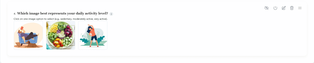 - Instruction: Click on one image option to select (e.g., sedentary, moderately active, very active)