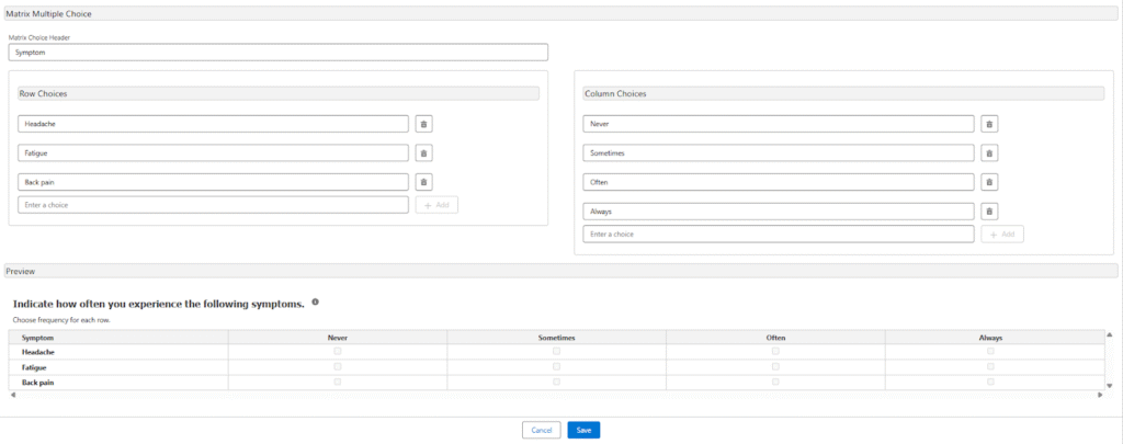 - Row Choices: 1) Headache 2) Fatigue 3) Back pain