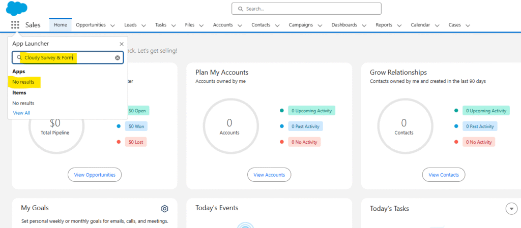 Once these steps are completed, the user should log out and log back in, and the Cloudy Survey & Form application and tabs will be visible in their App Launcher and navigation bar.