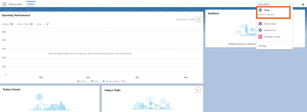 - Click the gear icon in the upper-right corner of Salesforce.