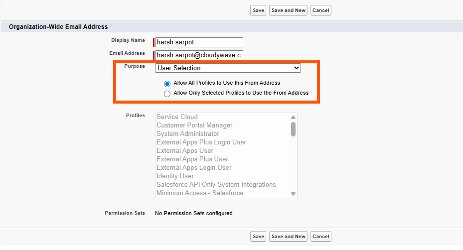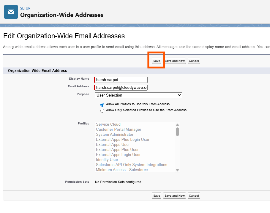 - Select the radio button Allow All Profiles to Use this From Address. Emails will not be sent to the user if a profile is not selected