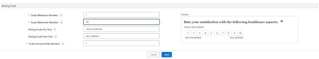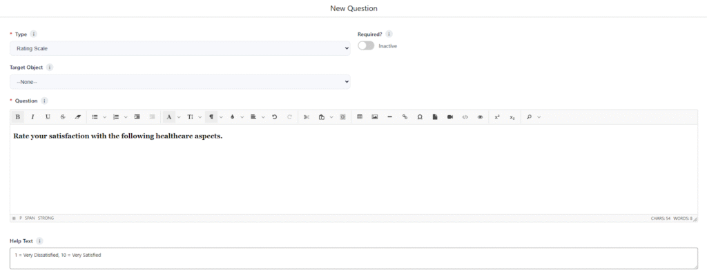 - Help Text: 1 = Very Dissatisfied, 5 = Very Satisfied