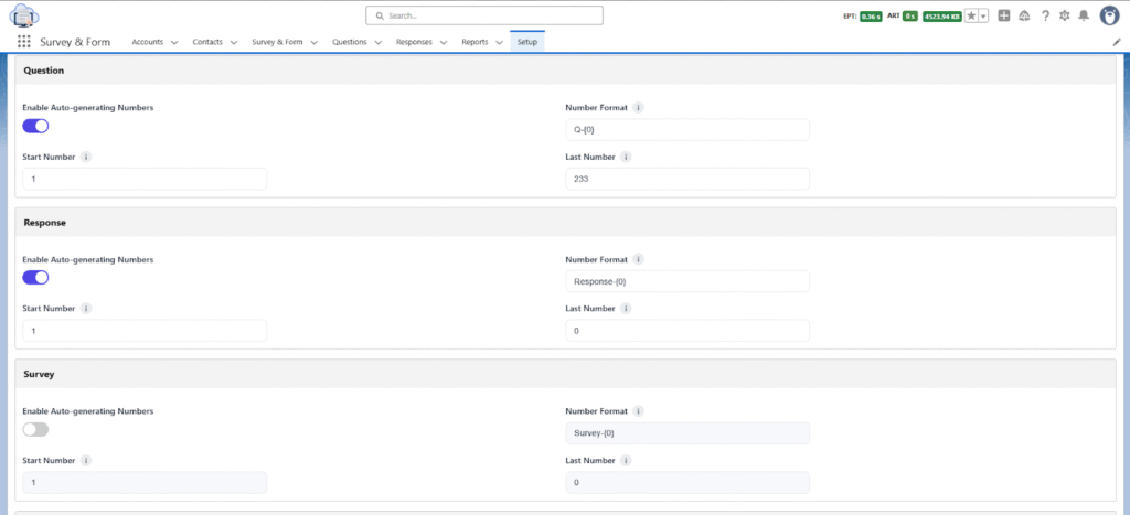 | Number Format | Defines the naming pattern (Ex: Q-{0}, Survey-{0}). |