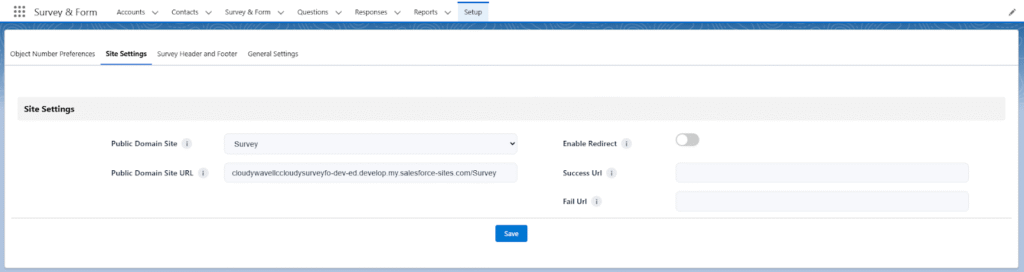 | Public Domain Site | Select the Salesforce Site used to host public surveys. |