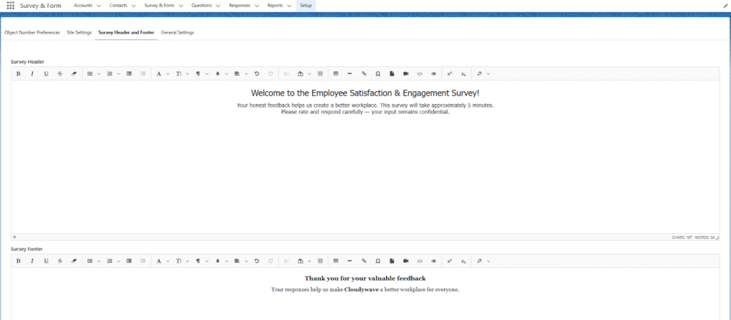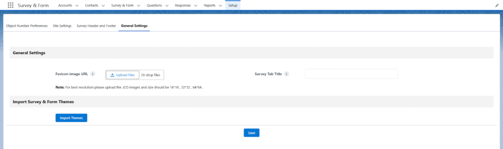 The Setup tab in the Survey & Form app allows administrators to configure global settings that control how surveys behave across Salesforce.