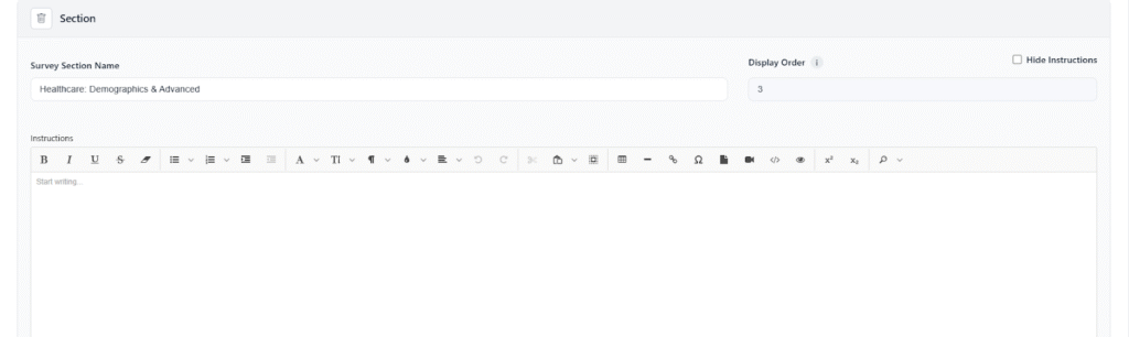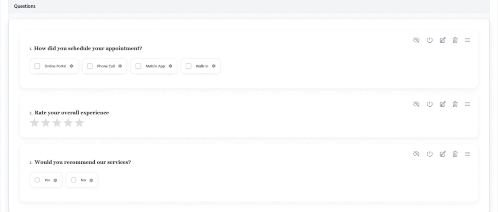 - Drag and Drop: Enables users to easily reorder questions or move them between sections to adjust the flow of the survey.