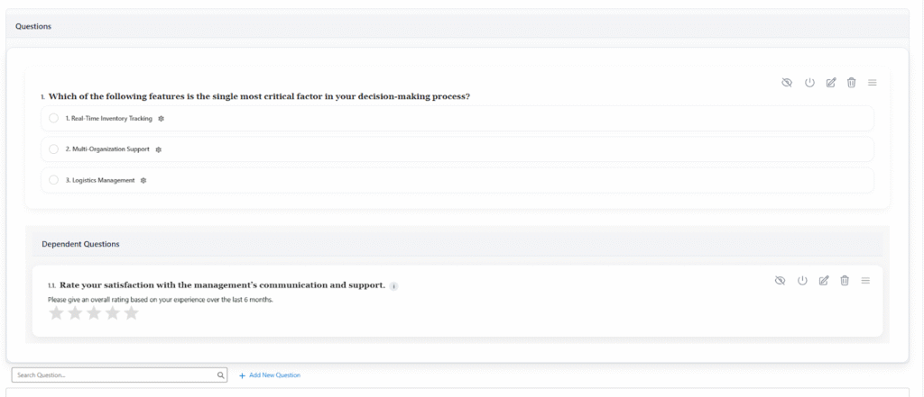 - Activate/Deactivate Question: Controls whether a question is active (visible to respondents) or inactive (temporarily hidden).