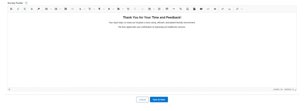 - Save & Next: Saves the entered header and footer details and navigates to the next step in survey creation.