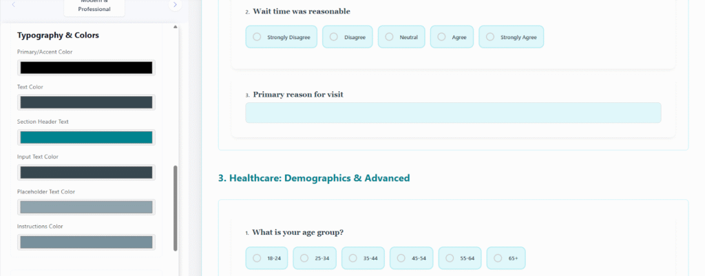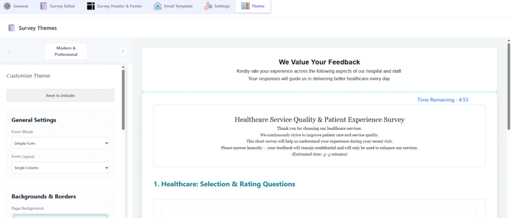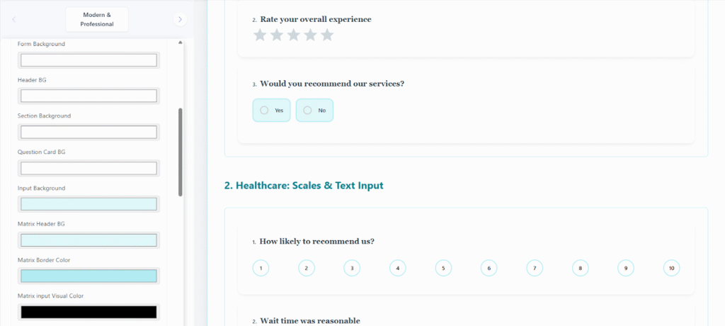 - Survey Themes: The base visual style of the survey, selectable from a list of options (e.g., “Modern & Professional”).