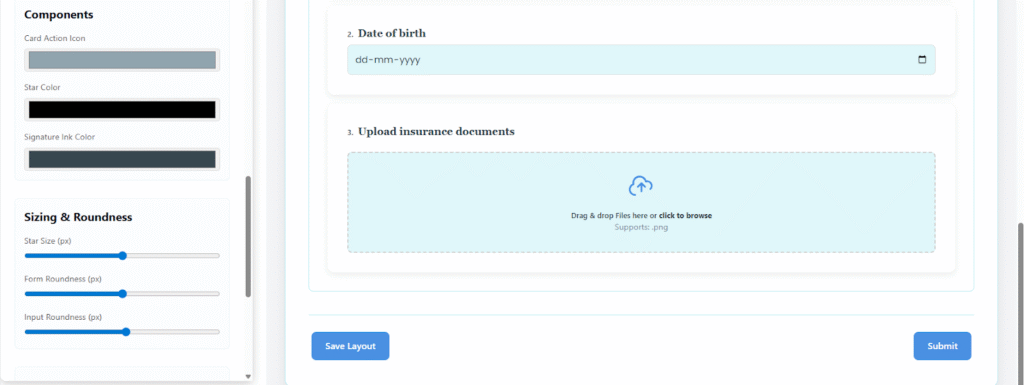- Form Roundness (px): A numerical value (in pixels) controlling the corner radius of the main form container.